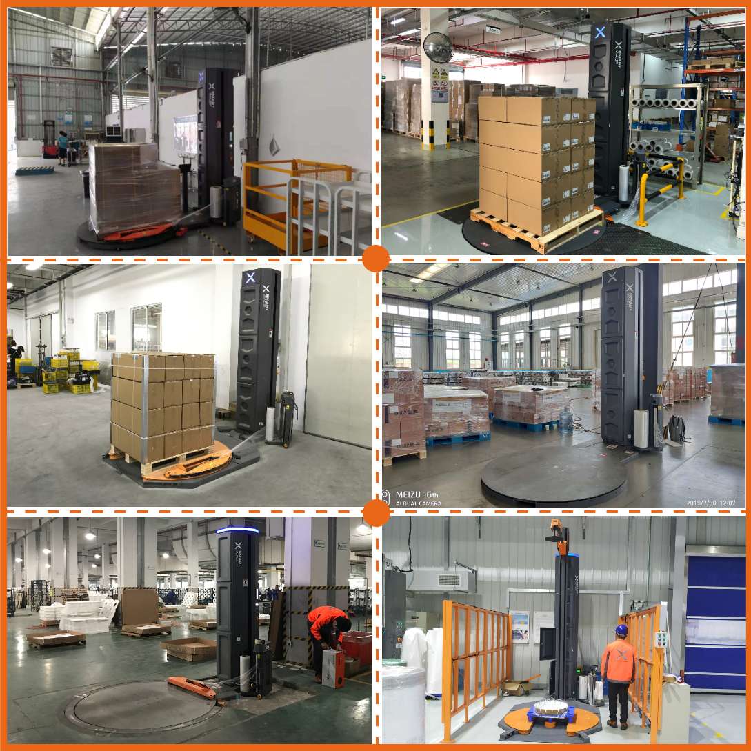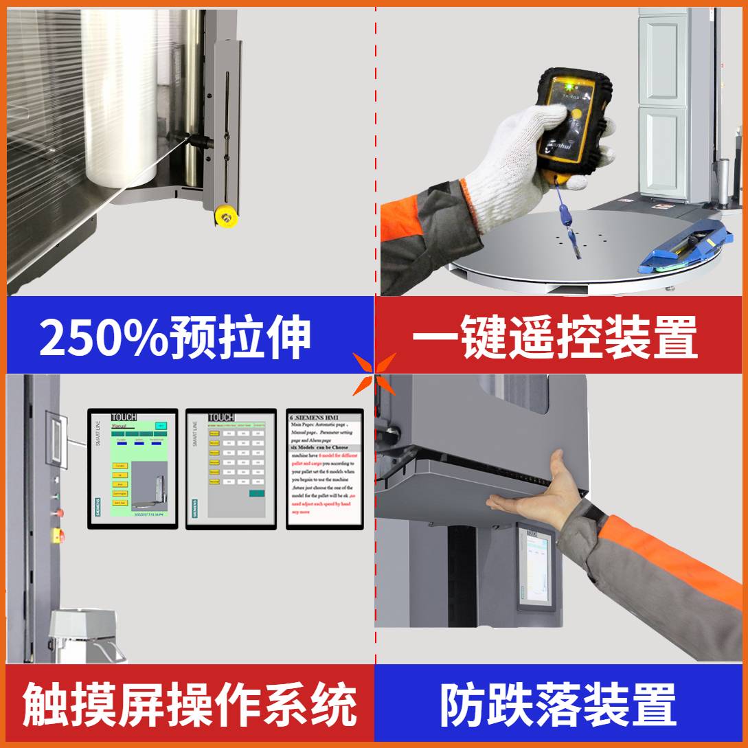 小黃蜂全自動(dòng)智能纏繞膜機(jī)X100,采用全自動(dòng)上斷膜裝置,搭配遙控裝置,操作員在將托盤貨物放置在圓